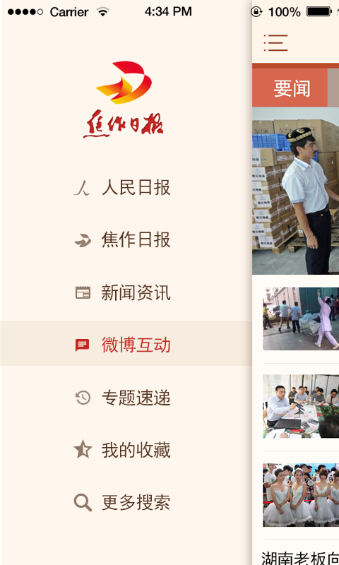 3.焦作日报新闻客户端操作界面共设七大功能,在时尚、便捷的侧滑抽屉式菜单提示下,用户不仅可阅读、下载一周内的报纸,还可将新闻资讯、微博互动、专题速递、我的收藏、更多设置等尽收囊中。在时政、社会、文化、国际、经济、体育、地方、图片等新闻资讯板块下,领略怀川之美,点击博闻天下。用户还可操作评论与分享功能,将自己所思所想与他人分享品读。