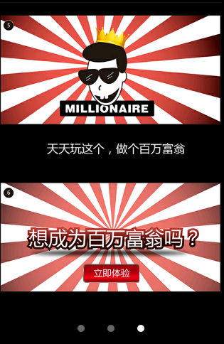 2、游戏娱乐:用户通过"百万问答""百万刮刮" 和"百万拍拍"等游戏环节赚积分,抽奖品,赢取百万富翁桂冠。