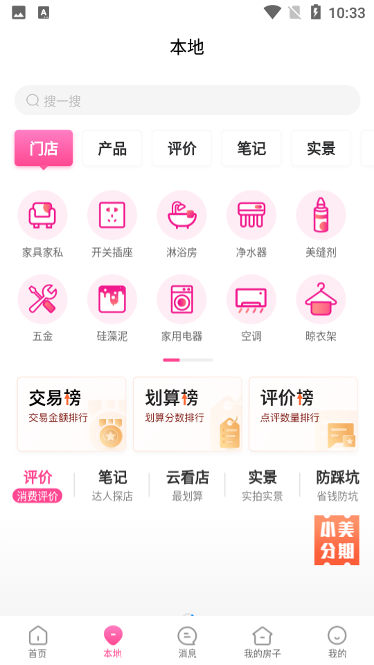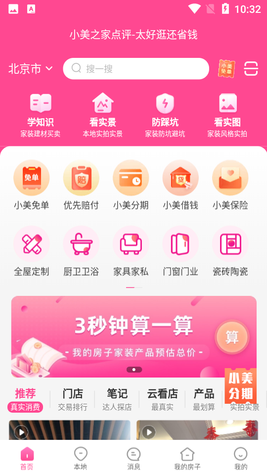 家装大平台,下载小美之家学习家装建材知识,体验足不出户手机看实拍实景,家装避坑知识,家装风格了解。还能在线享受全屋定制。让你在购买各种建材家具的时候,可以先在这里瞧一瞧。在平台上面你可以轻松的找出全程的优惠家装活动的建材商城,不需要出门也能够发现全城的建材门店的优惠信息,当你需要装修新房或者进行老房改造的时候就更加的优惠而且方便。