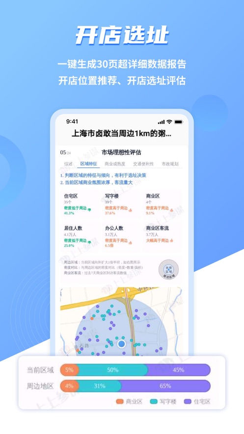 上上参谋创业开店是一款对于创业人的软件,无论是开店选址还是行业报告、竞争分析都给你分析的明明白白,你只需要想好你准备开什么店在哪里开预算是多少,后面的一切它都可以帮你计算好,创业项目找店铺位置、加盟连锁品牌投资开店,用AI大数据为你呈现周边银行,地铁,店铺,超市,餐厅,商店,便利店等交通和商业地图,助你建设经营营销开店,好的选址就是开店成功的开始.