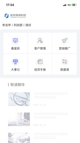 3.平台的首页包括看星辰客户管理,营销推广,大事记,信贷手册,数据港