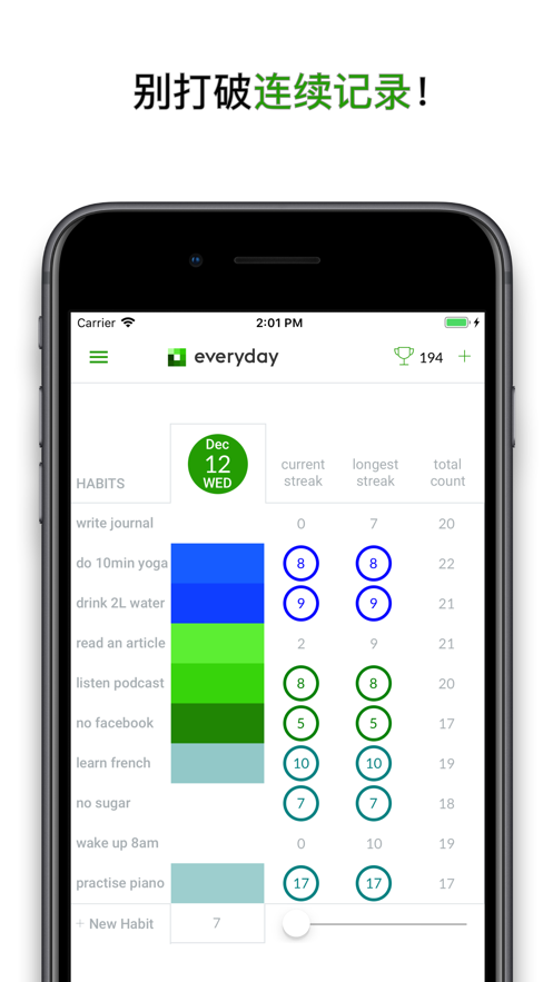 - 习惯进度,一目了然:用简洁美观的追踪面板,轻而易举地鞭策自己,每日保持好习惯。坚持的时间越长,面板就越漂亮!