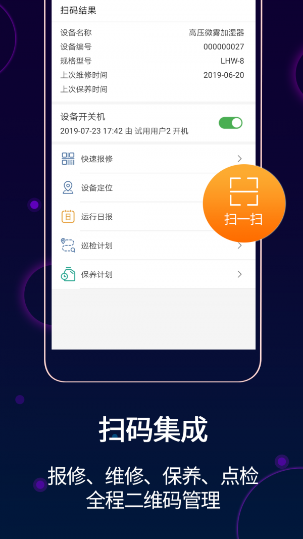 扫码报修:通过扫描二维码的方式来选择设备进行设备报修。