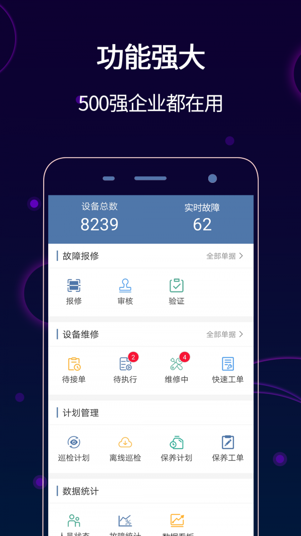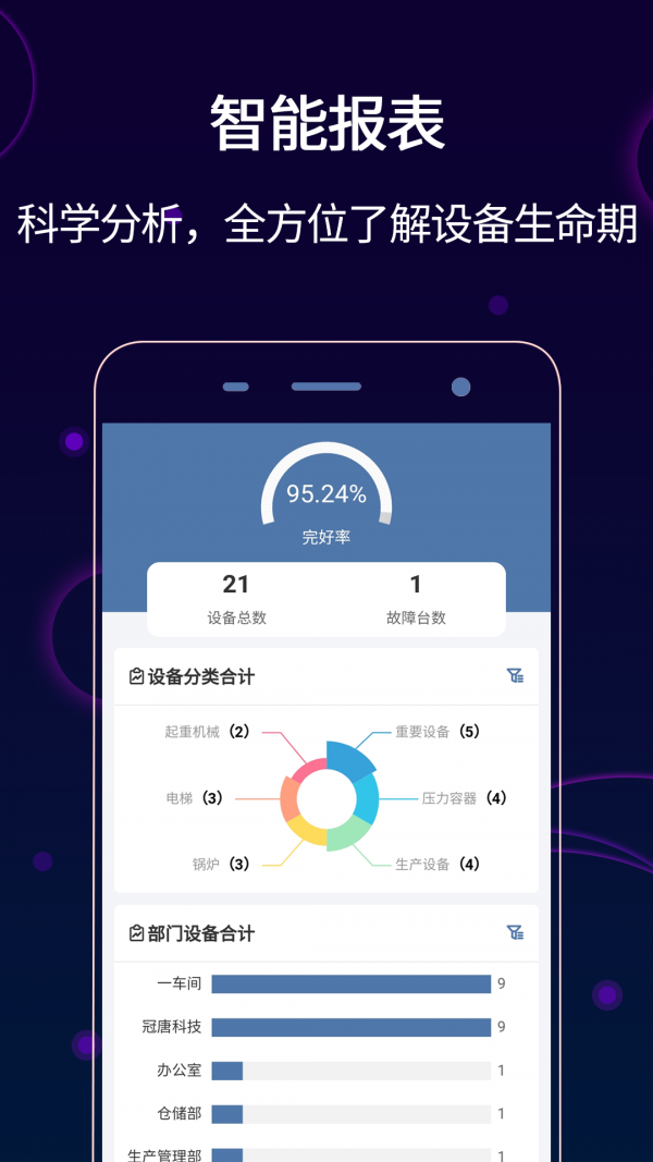 企业设备管理必备系统,集设备管理、特种设备管理,维护保养、备件仓库、故障报修、业务管理(调拨,购置...)、点巡检为一体的设备全生命期管理软件,配合电脑端后台管理;支持二维码/条形码管理,包含:pc、平板、(安卓+苹果)手机app、微信小程序、企业微信、钉钉,多方位的信息接入,真正的设备“云管理平台”。