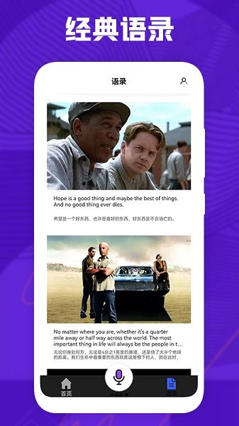十点配音宝app安卓版是一款主打配音相关功能的软件,可以为自己的作品配上想要的背景音乐,用户可跟随它们来学习配音。通过平台整理好的各场景配音模板一键使用进行自己的作品制作。同时软件还提供了多种音频处理效果,让配音效果更上一层,同时可以保存自己的录音,录音剪辑。经典台词,热门语录,这里都有。不会玩?没关系,有配音示例,学一遍就会啦。如果你对配音感兴趣或是有配音的需求,那么不妨下载十点配音宝app看看吧!