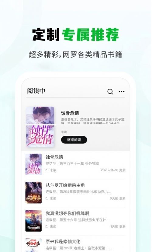 3、云同步读书记录,快速更新序列化的书章以及多套精美的书架皮供您选择。