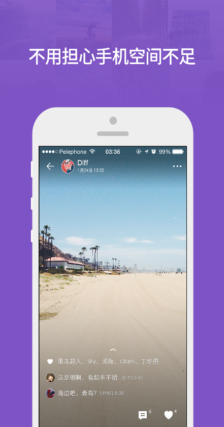 一键创建共享相册,支持多人分享照片集,解决旅行、宝宝、party等海量照片多人共享难题,还可以省流量分享到微信、微博、qq空间哦!