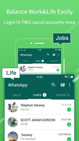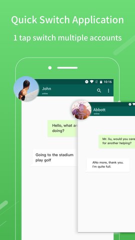 2、在一台设备上同时运行多个帐户,支持同一手机上多个帐户的稳定登录和使用,可以通过不同的帐户连接不同的朋友,还可以区分工作和生活空间,克隆的帐户和主帐户之间的数据分别存储,并且消息不会相互干扰。