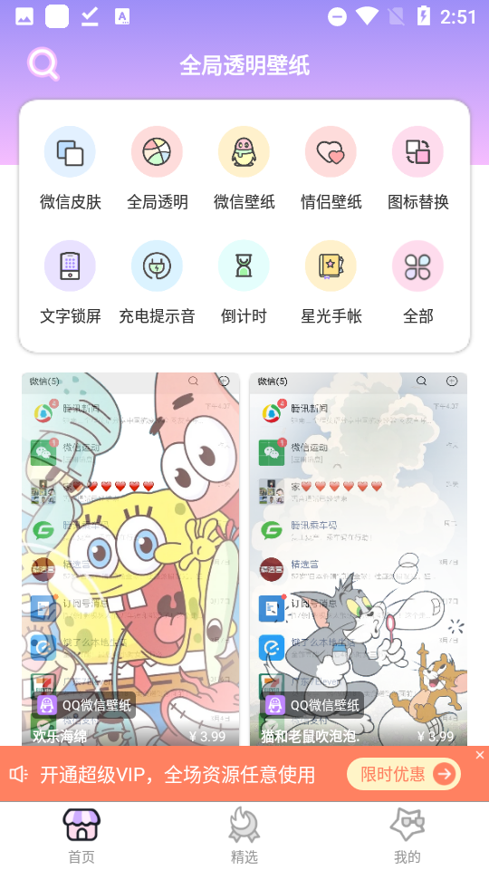 非常优质的手机个性美化工具,提供了很多的壁纸和主题资源,可以设置微信全局透明皮肤,分类很详细,还有图标替换、文字锁屏、充电提示音等。把好看的视频内容一键设置为手机动态壁纸以及透明壁纸,让你的手机锁屏桌面主题设置不同动态壁纸,也能设置微信qq聊天壁纸背景。快来下载试试吧!