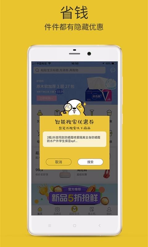 近百名工作人员人工筛选,每天精选近百万个最新优惠信息,涵盖日用品,百货,家居,食品,服装,护肤品等数百个品类,随时随地为平台使用者提供一站式“省钱”需求