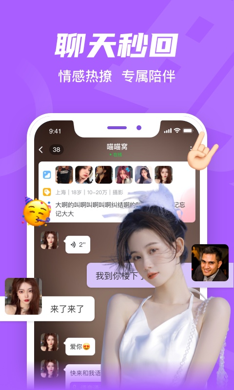 就聊是一款同城附近陌生人,聊天、交友、约会、恋爱的社交平台。24小时在线甜言蜜语爱聊,探探附近单身异性,聊聊人生、聆听陌声。以视频、语音、文字等多种方式,多场景为上千万用户创造更多恋爱机会,帮单身男女找到自己的理想对象。来就聊,不陌生!