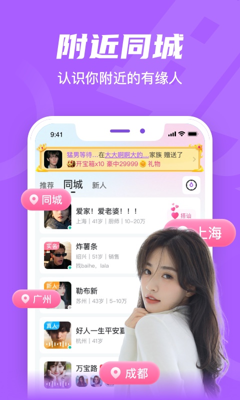 附近同城:根据用户当前所在城市,自动为用户推荐同城及附近城市的异性。