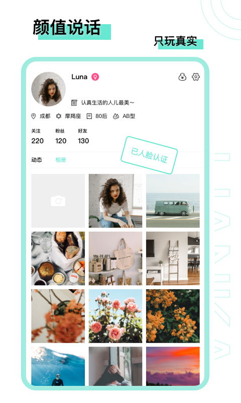 脸咔app是一款基于人脸搜索的社交APP。想要真实可靠地社交平台,就来脸咔app吧,这里需要经过人脸识别认证才能使用,你可以在这款软件里通过语音、文字、图片展示你自己,获得关注。结实你感兴趣的用户,畅快聊天,去认识更加真实的朋友们,与他们一起找到互动的欢乐,去邂逅那个与你心动的ta,每天都能够在线畅快互动,玩法丰富,交流起来无距离,语音视频随便你怎么撩。