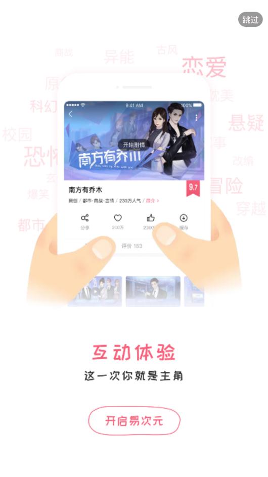 互动是二次元小说阅读平台!《易次元》不仅拥有丰富的小说阅读资源,更可以让你在这款软件中享受到图文式的点击阅读方式哟!软件拥有丰富的作品,拥有精美画风,互动阅读体验,让你畅享不一样的阅读乐趣,主推热门文字剧情玩法,电子小说,互动式小说等,以精彩的剧情为产品卖点,摆脱文字的拘束,以CG或动漫为辅表演剧情,并设立支系和好几个结局。大量互动交流文字作品,颠复传统式小说、漫画阅读方法,精致风格、多主线多结果浸入式剧情,让你全新升级阅读文章感受。