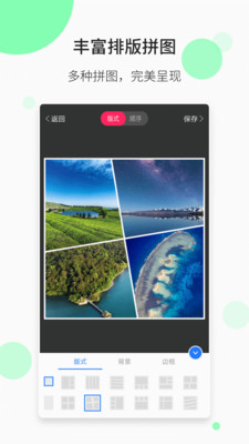 2.拼图拼视频,图片和视频混合拼。可以修改模块形状、边框大小、背景色、圆角;还可以设置背景音乐