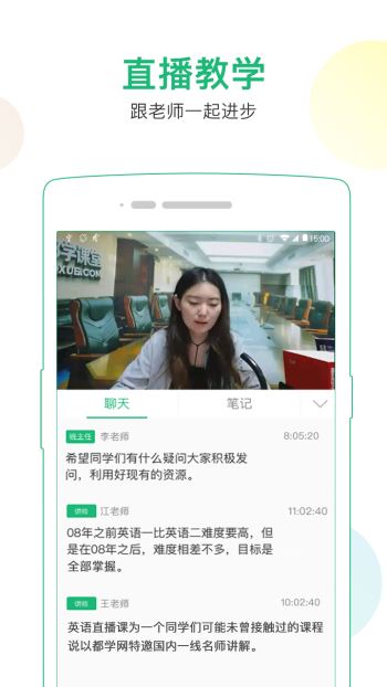 3.观看直播,发送弹幕与老师实时互动,记录笔记;
