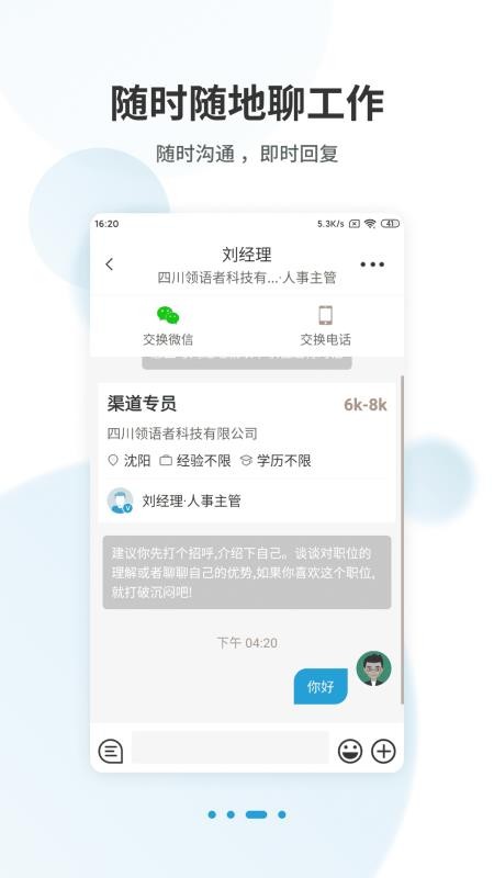 快速交流:与企业的HR在线交流,通过交流才可以增加对职位的了解程度;