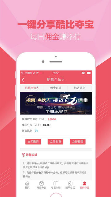 3、一键分享酷比夺宝,百万佣金等你赚;