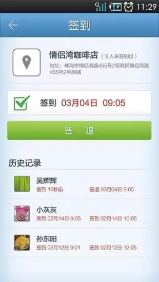 签到签退:以用户当前位置为中心,搜索附近一定范围(可自定义)内的签到点进行签到签退