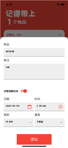 记得带上是一款非常好用的生活服务类型的软件,拥有多种不同的记录功能,可快速创建备忘录并设置提醒时间,提醒您在出门前做好必要的准备。适合日常生活中的出门备忘,比如提醒带上钥匙、手机、钱包等,可以将各种各样的物品信息进行自定义的添加,还可以将提醒信息设置出来,在更改或者是查看的时候也能够更加的方便,快来这里下载试试吧。