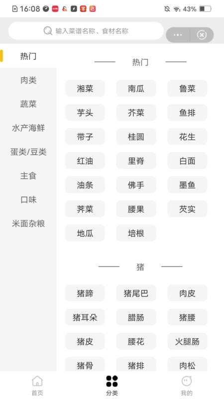 1. 在软件中选择感兴趣的菜谱分类,浏览和搜索感兴趣的菜谱。
