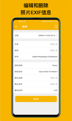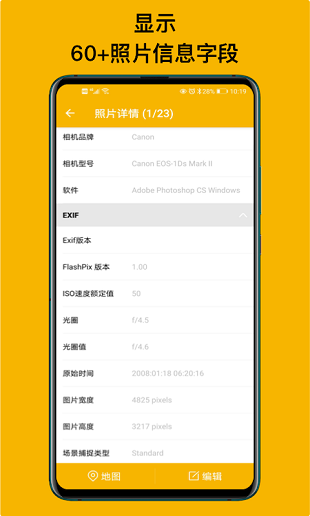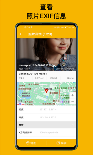 2. 显示照片的详细EXIF信息,包括拍摄时间、地点、设备型号等。