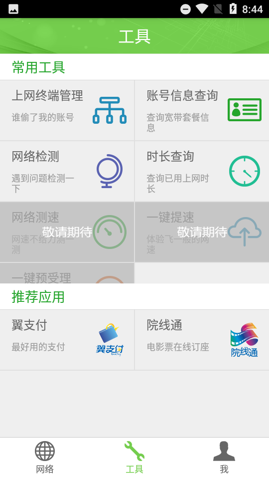 2. 根据需求选择相应的功能,如账户管理、网络测速、故障报修等。