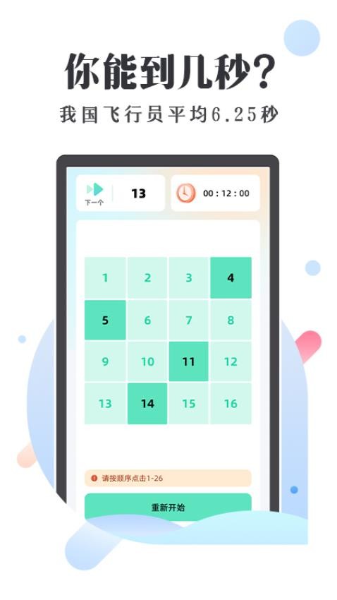 1. 舒尔特方格训练:通过快速寻找指定数字或字母的顺序,锻炼用户的注意力和反应速度。