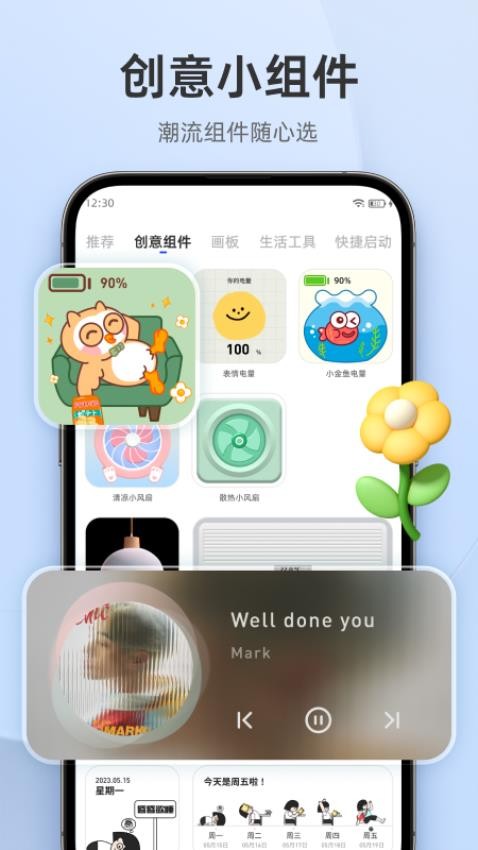 1. 多种小部件选择:提供天气、时钟、日历、待办事项、音乐控制等多种类型的小部件,满足用户不同的需求。