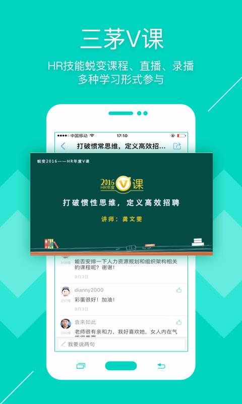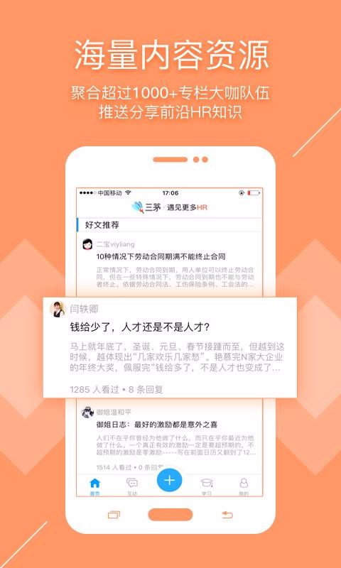 三茅HR是专门针对HR和职场人士打造的一款学习应用,以移动学习为主题,在线分享众多优质的行业资源,行业资讯、深度HR专题栏目等内容都有,并且还为职场人士打造专属精英圈子,线上分享从业经验,助力更多新朋友学习知识;每天都有一个案例话题,数百位专家大咖为您带来与之相关的内容,供全国多行业的精英伙伴学习;每天只需要花费5-20分钟左右的时间就能够学习专业知识,助力您成为一名更优秀的人;同时还可以学习到企业管理知识,让HR轻松管理公司,管理员工,助力企业发展,欢迎感兴趣的朋友下载软件学习职业知识。