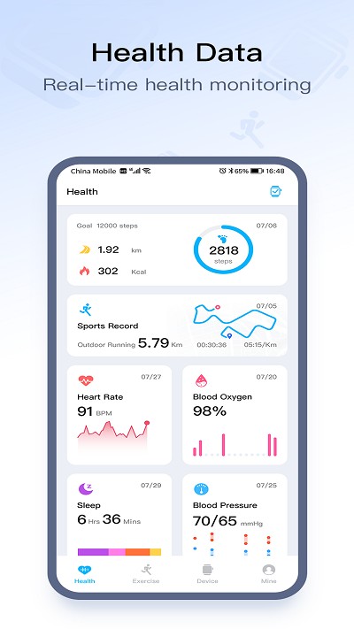 2. 健康监测:实时监测心率、血压、血氧等健康数据,提醒用户关注身体状况。