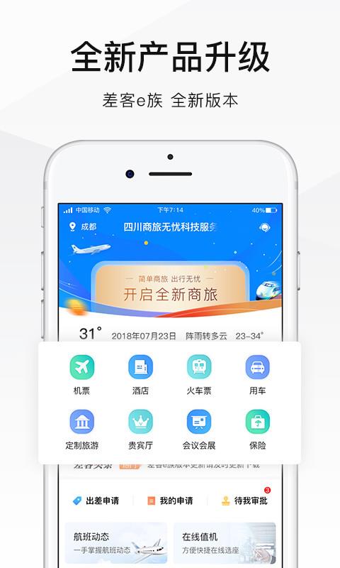 差客e族app是一款专为企业提供差旅服务的应用,能够为需要出差的人提供一站式的差旅解决方案,使其在出差的每一个环节问题都能轻松的解决,如可以在下预订酒店、购买机票、打车以及代办签证等服务内容可以给予每一个出差的人便利,在出差之前就能提前解决好一切的事务,这样就能轻松愉快的出国或是去外地开展工作,适应于各行各业的需要出差的人。对于每一个需要出差的人来说,在此也能处理好了与上级对接的工作事务,如可以在此发起出差审批或是费用报销申请等,随时随地就能完成,根本不需要其他的办公设备即可解决好一切的出差事务,非常的实用,有需求的话马上下载吧。