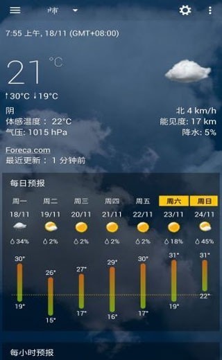 3. 天气预报:提供未来几小时内的天气预报,包括天气状况、温度范围等信息。