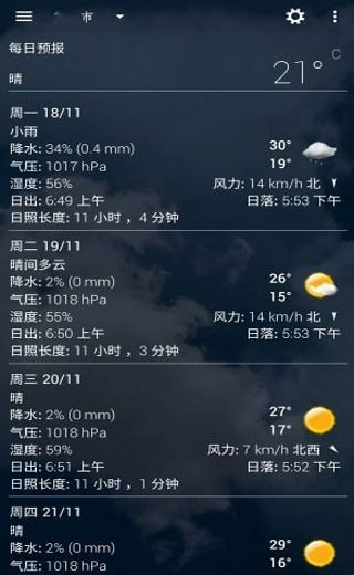 2. 天气状况:显示当前天气状况,包括天气图标、温度、湿度、风速等信息。