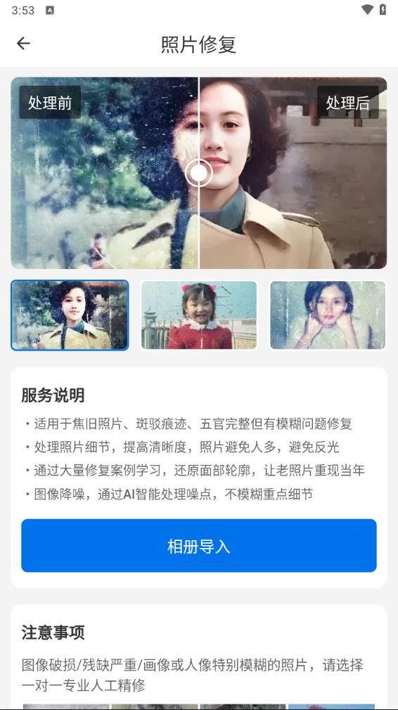 安捷照片修复app是一款专注于老照片、损坏照片修复的移动应用。它利用先进的图像处理技术,帮助用户将珍贵的回忆恢复到最佳状态,让每一张照片都能重新焕发生机。