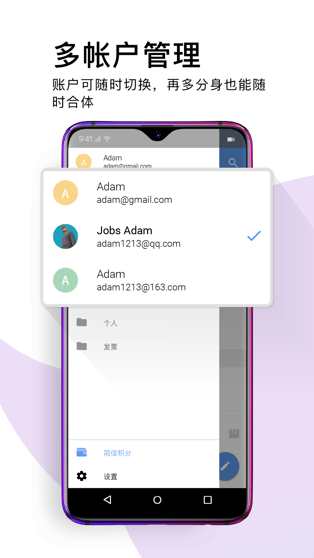1. 多账户管理:支持添加多个邮箱账户,包括常见的Gmail、Outlook、QQ邮箱等,实现统一管理。