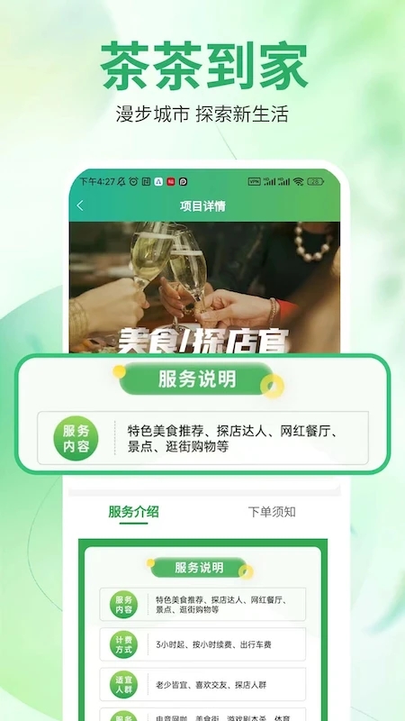 茶茶到家app是一个全国首家针对旅行出游的新服务平台,其目标是整合城市和乡村资源,满足人们出行、旅游、消费精致服务的需求。用户可以通过此应用随时开启城市美食探索、品质店铺攻略,并享受茶茶礼仪官提供的专业服务。