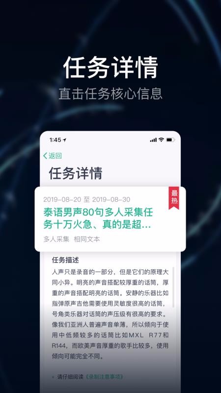 智能推荐最新、最热的语音数据采集任务,通过录制相关音频内容的方式帮助完成采集任务;
