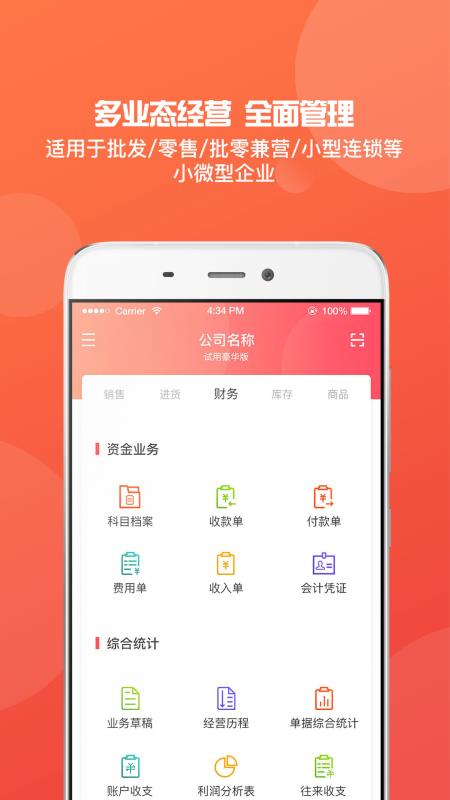 全面办公,线上可以处理销售、进货、财务以及库存与商品的事务;