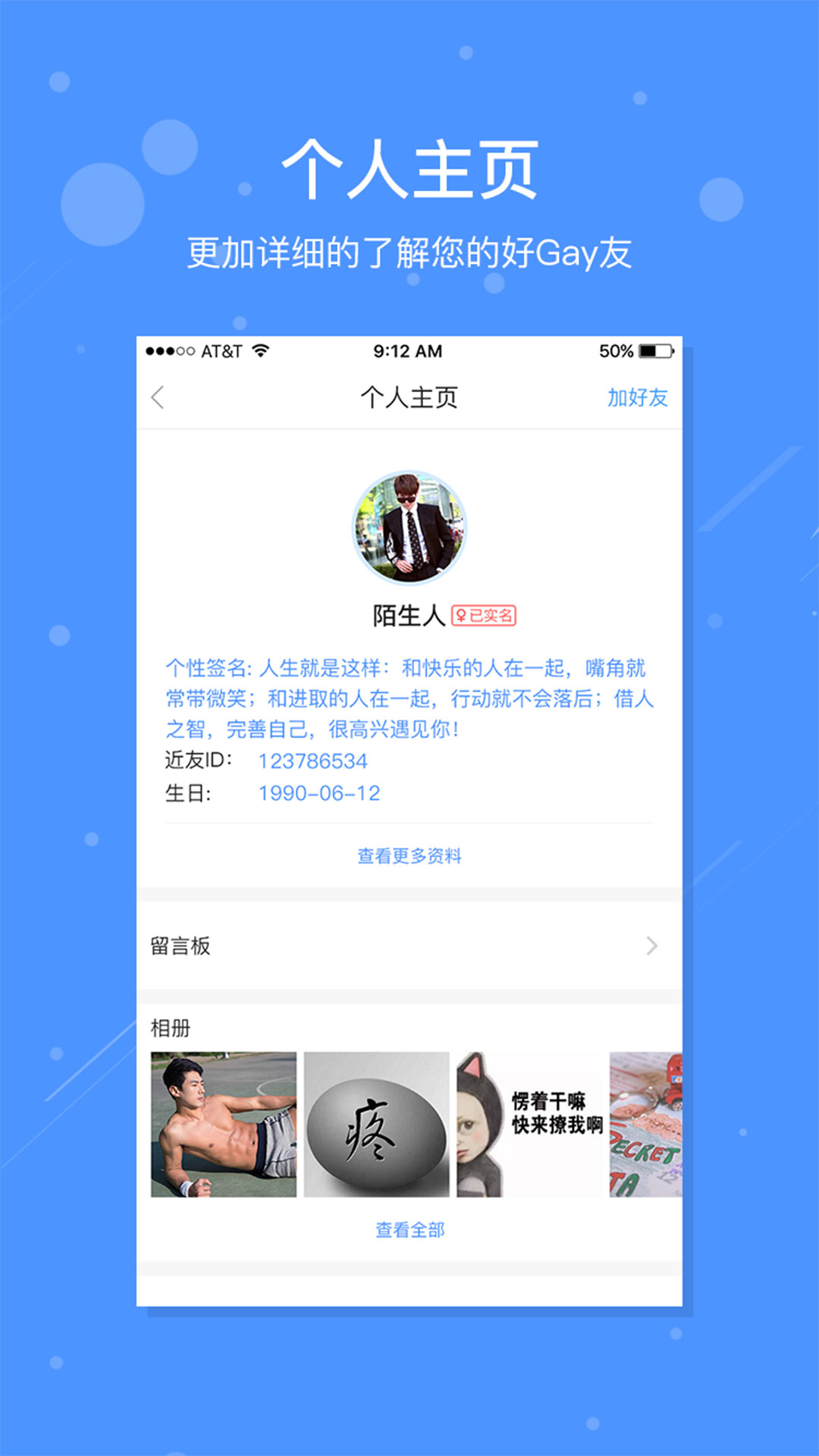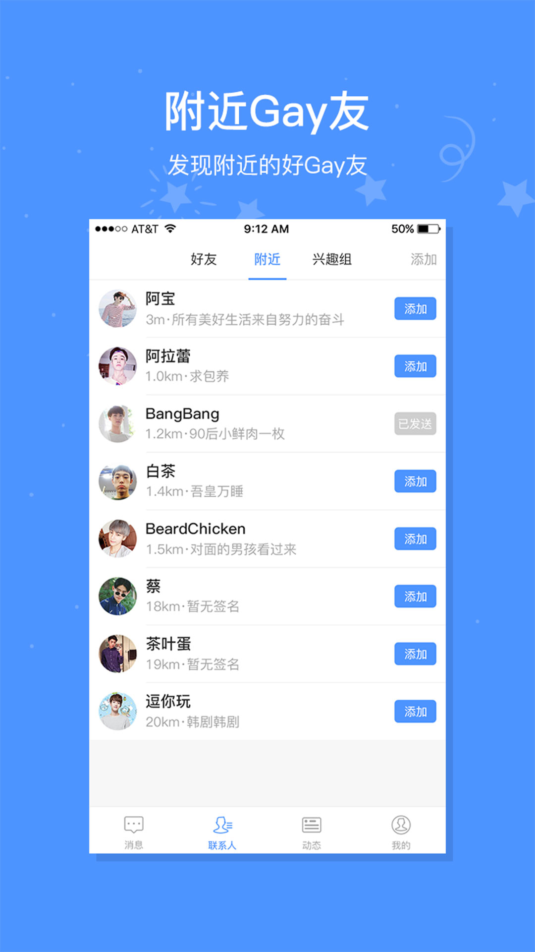 3. 附近的人:通过定位功能,用户可以查看附近的其他同志用户,拓宽交友圈子。