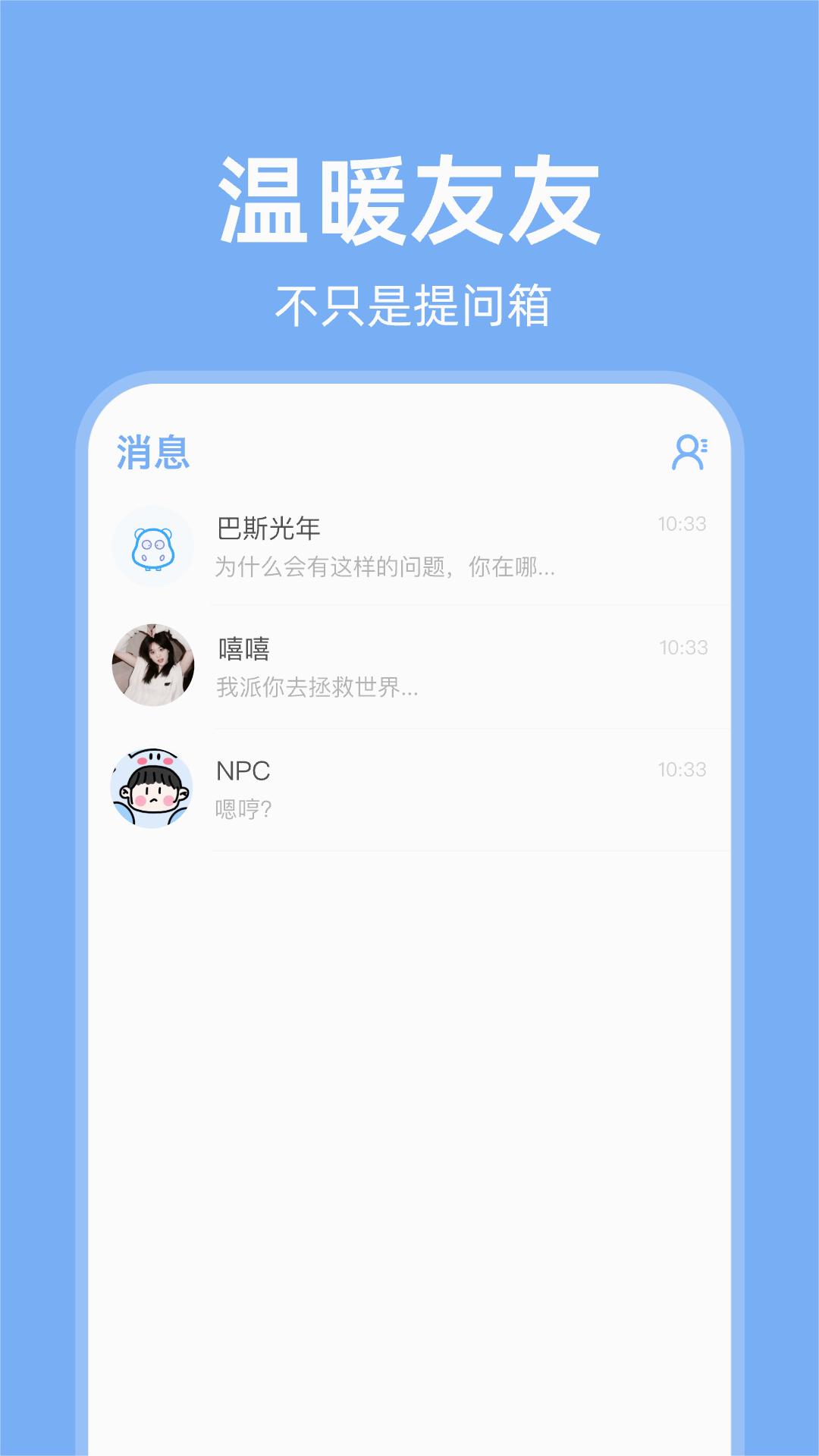 友达提问箱是一款集合问答与社交功能的移动应用程序,旨在为用户提供一个轻松、自由的交流平台。用户可以在这里匿名或公开地提出自己的问题,并获取来自其他用户的解答,同时也可以回答他人的问题,实现知识的互通与分享。该应用由北京此刻有趣科技有限公司开发,支持Android平台,最新版本为v3.5.1。