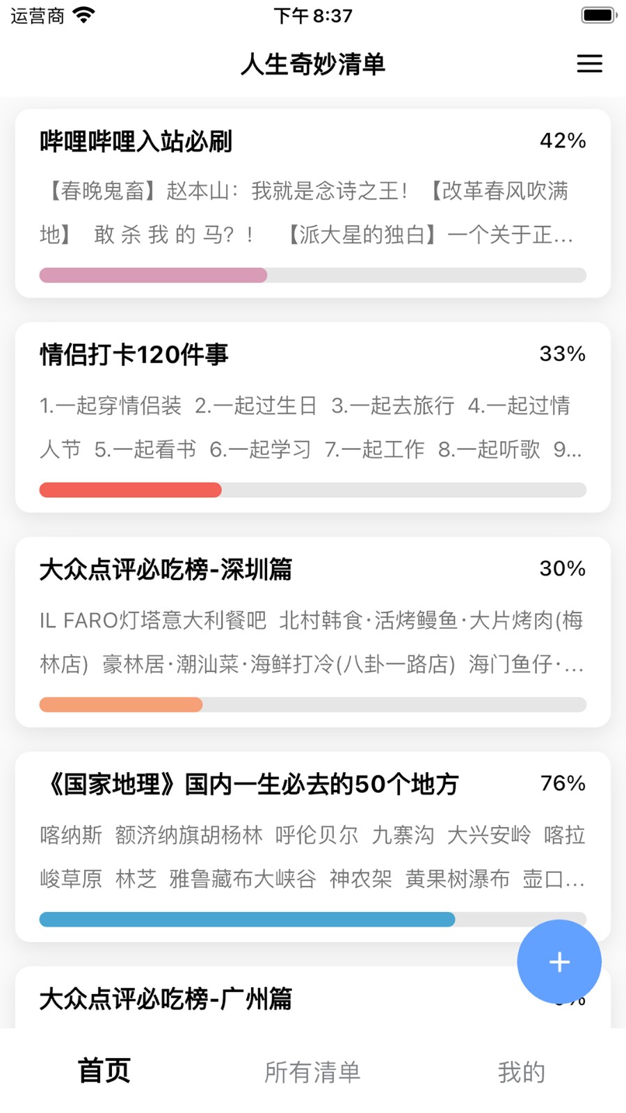 人生奇妙清单通过简洁直观的界面设计,结合智能提醒与数据分析功能,鼓励用户将长远目标分解为可执行的小任务,逐步达成。同时,它也是一个记录生活点滴、捕捉灵感火花的私人空间,让用户在忙碌之余也能享受生活的美好。