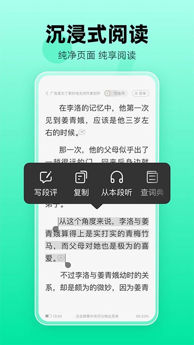4. 免费听书,解放双眼:支持语音朗读功能,多种声音任你选择,实现真正的懒人听书。