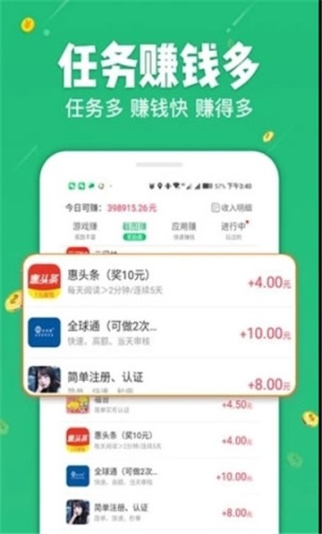 1. 赚钱任务:包括注册下载、关注公众号、参与问卷调查、观看广告视频等多种类型,任务丰富多样,满足不同用户的需求。