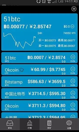 3.行情:提供国内外主流比特币交易平台的交易价格、交易量,帮助玩家掌握交易数据,还可以提供比特币K线,功能做到了传图股票K先水准,国内独一无二!