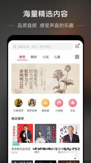 4. 电台听书:开设电台听书频道,提供音乐故事、个人提升、相声评书、少儿读物、商业财经等多类频道的有声内容,帮助用户抓住碎片时间,丰富生活娱乐体验。
