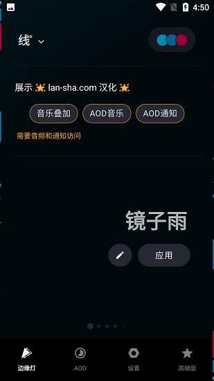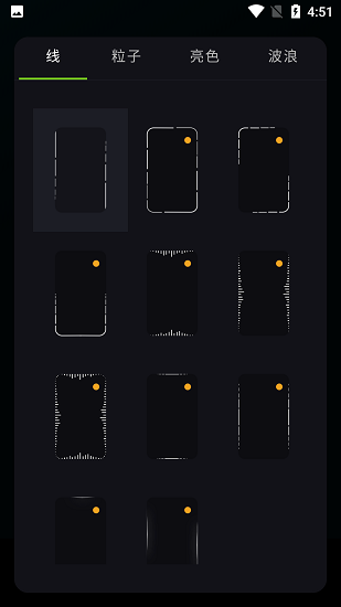 2. 设置边缘灯:进入主页面后,点击左上角进行边缘灯显示设置,选择喜欢的显示样式(如线、粒子、亮色、波浪等)。