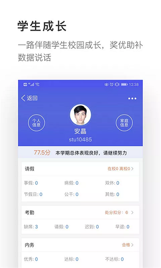 5. 查看与统计:在App中查看学生的出勤情况、内务检查结果、操行评分等数据,并进行统计与分析。