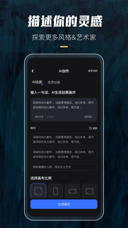 3. 开始创作:在APP主界面上,用户可以选择“智能绘画”功能进入创作界面。然后,输入关键词或导入图片作为创作基础,根据需要调整各项参数进行创作。创作完成后,用户可以预览并保存作品到本地相册或分享到社交平台。