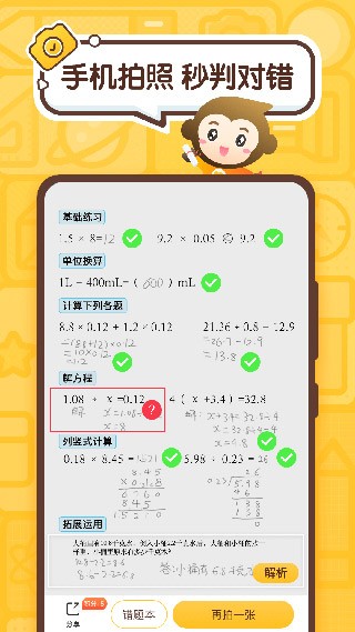 1. 拍照检查作业:打开小猿口算APP,点击“拍照检查”按钮,对准作业拍照,即可快速获取批改结果和解析。